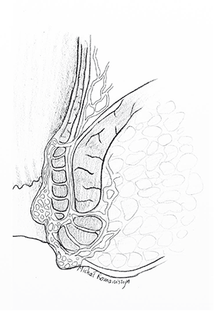 Hemorrhoid pochodzi od greckich słów: haema – krew i rhoos – przepływ. Prawdopodobnie pierwszy użył go w opisie przypadłości Hipokrates („Corpus Hippocraticum”) w 460 roku p.n.e. Intrygujące słowo znane od tysięcy lat w różnych językach (emerods, `ophalim, techorim).1,2 Oznacza anatomiczną strukturę, atawistyczną u człowieka, a istotną dla przeżycia u zwierząt, gdyż uzupełniając aparat zwieraczowy zapobiega niekontrolowanemu oddawaniu gazów (i pozostawianiu śladu zapachowego – przyp. red.). Jest to podśluzówkowy splot tętniczo-żylny nazwany splotem odbytniczym wewnętrznym, utworzony przez końcowe gałęzie tętnicy odbytniczej górnej; splot ten ma połączenie ze splotem zewnętrznym znajdującym się pomiędzy zwieraczem wewnętrznym i zewnętrznym odbytu oraz komunikuje się ze splotem naczyń żylnych podskórnych (splotem odbytniczym dolnym) w otoczeniu szpary odbytu (ryc. 1).3,4