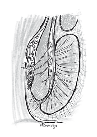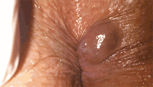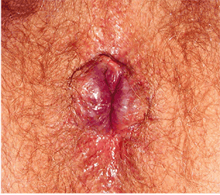 Klasyfikacja ta obowiązuje od lat 50. XX wieku i jest wciąż aktualna, jednakże poza wypadaniem nie uwzględnia innych objawów związanych z obecnością hemoroidów. Banov w 1985 roku poszerzył klasyfikację Golighera o krwawienie w I stopniu (pozostałe bez zmian).6 Z kolei klasyfikacja według Müllera-Lobecka dzieli stopień IV na IVa (z ostrą zakrzepicą) i IVb (z przewlekłym zwłóknieniem).7 W piśmiennictwie anglojęzycznym objawowe hemoroidy definiuje się za pomocą pojęcia hemorrhoidal disease, a posługiwanie się przez rodzimych specjalistów polskim odpowiednikiem „choroba hemoroidalna” (ChH) jest także uzasadnione i przyjęte.7 W dalszej części niniejszego artykułu określeniu objawów wynikłych z obecności hemoroidów będzie służył właśnie ów termin i skrót ChH. Klasyfikacja Golighera nie uwzględnia także zmian patologicznych w obrębie podskórnego splotu odbytniczego dolnego, określanego również mianem żylaków odbytu. Są one pokryte dobrze unerwionym nabłonkiem płaskim i mogą być źródłem ostrych nagłych dolegliwości bólowych wynikłych z wynaczynienia i podskórnego zakrzepu (ryc. 3).