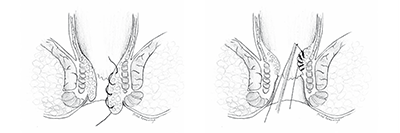 W grupie 1415 chorych leczonych metodą DGHAL u mniej niż 1% obserwował pozabiegowe krwawienie i u 1% – szczelinę związaną z zabiegiem. W grupie ponad 800 chorych operowanych przeze mnie nie było powikłań śród- ani pozabiegowych. Wyniki dobre i bardzo dobre dla II i III stopnia stwierdza się u prawie 80% operowanych.38 Wątpliwości może budzić stosowanie DGHAL w IV stopniu ChH ze znacznie przerośniętymi fałdami skórnymi. Jednak przekonujące jest stwierdzenie, że podwiązanie naczyń hemoroidalnych skutkuje nie tylko zmniejszeniem objętości guzka krwawniczego, ale – wywołując odczyn zapalny – powoduje bliznę, obkurczenie włókien kolagenu i zmniejszenie wypadających fałdów anodermalnych. Natomiast ich pozostałości można usunąć w znieczuleniu miejscowym, ograniczając w znacznym stopniu pozabiegowe dolegliwości.39-41 Obserwacje, w tym wieloośrodkowe potwierdzają skuteczność plastyki RAR (recto-anal repair) jako uzupełnienie DGHAL w IV i czasami w III stopniu ChH. Plastyka RAR polega na podwieszeniu wypadającego guzka hemoroidalnego za pomocą szwu założonego powyżej linii zębatej (ryc. 8).