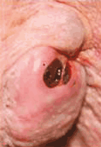 Zakrzep splotu podskórnego, czyli zakrzepica w żylaku odbytu (p. ryc. 3) powinien być rozwiązany doraźnie, zanim dojdzie do samoistnego przedziurawienia (ryc. 10).